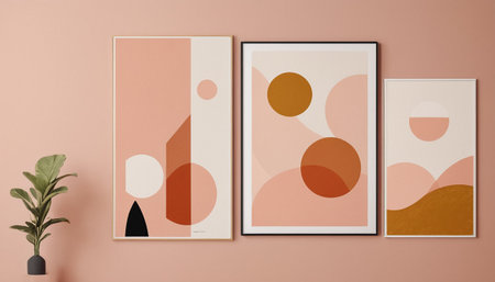 Stylish framed fine art prints arranged in a grid pattern, highlighting bold colors and abstract designs.