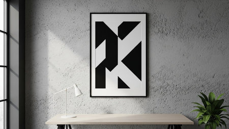 Designer workspace with photo frame on the wall. Mock up, 3D Rendering