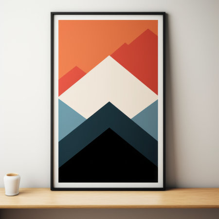 this art print features a stunning alpine valley in a geometric style, inspired by the works of aaron douglas. with a dark blue and orange color palette, it showcases colorful and eye-catching compositions. the clean lines and pure forms create a visually appealing aesthetic, while the complex layers and textures add depth. the rim light adds a touch of drama, resulting in a highly detailed