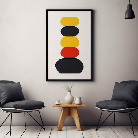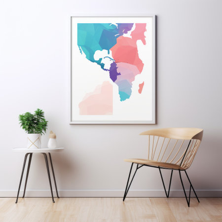 Brighten your space with this geometric artwork featuring vibrant gradient hues. Perfect addition for modern interiors, combining bold patterns with a chic, minimalist chair and leafy plant. Generated AI.