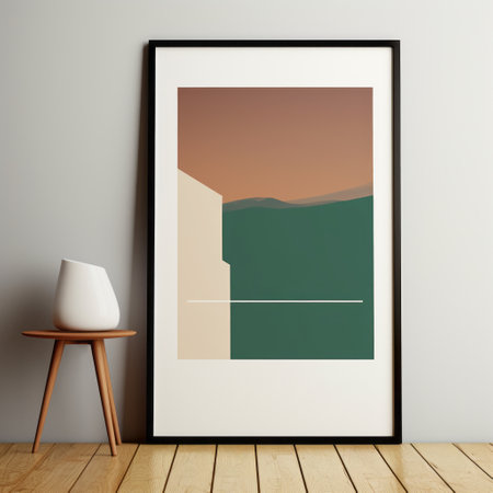 a framed print featuring a serene minimalist style, showcasing a captivating picture and the word. inspired by the works of tarsila do amaral, wes anderson, and soraya saga, this artwork exudes a serene atmospheric perspective. influenced by greek art and architecture, the color palette consists of light maroon and dark green, creating a harmonious and captivating visual experience. ai generated
