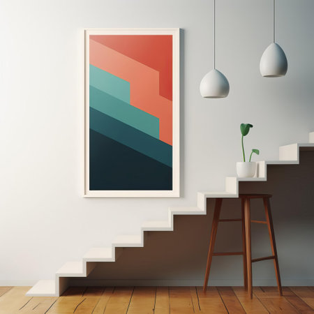 orange abstract modern minimalist poster design art print featuring a pixelated staircase. the design is inspired by polychrome terracotta and showcases a unique framing and composition. rendered in cinema4d, the poster combines light black and light beige tones for a contemporary aesthetic. perfect for adding a touch of modernity to any space. ai generated