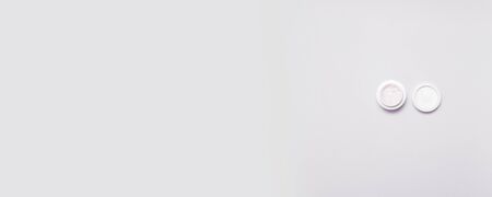 Top view of plastic jar with cosmetic on gray background with copy space. Container for cream, foams and other cosmetics. Minimal composition