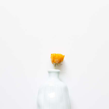 Vase of dry yellow ranunculus flowers on white background. flat lay, top view, copy space
