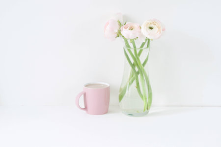Fashionable stock background - flowers in a vase on a white background. Women's wedding or greeting background with copy space.