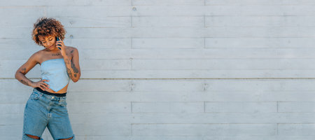 latin african american girl with tattoos talking on mobile phone isolated on street wall