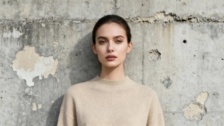 Female model wearing a plain neutral beige woolen sweater, shot in daylight against a rugged, textured gray concrete surface showing peeling paint and damage.