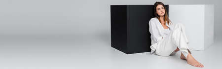 brunette barefoot woman sitting near black and white cubes on grey background, banner