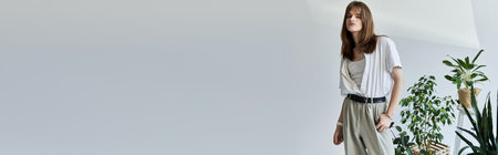 Dressed in fashionable clothes, a young man confidently poses amidst lush indoor plants.