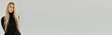 Long-haired beauty poses gracefully in a stylish black outfit, highlighting modern fashion trends, banner