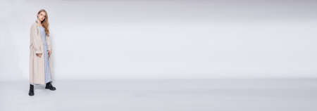 beautiful girl in beige raincoat posing in Studio on gray background. girl in motion, free space for. horizontal banner for website design, portrait, copy space
