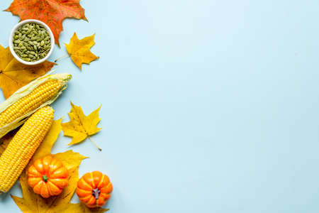 Fresh ripe pumpkin and corn on a mint blue background. Thanksgiving Autumn Concept. Flat layout. Empty place for text
