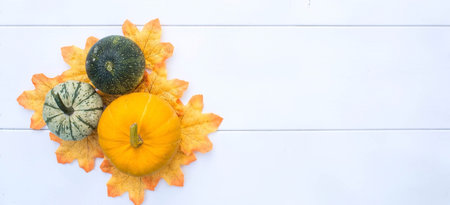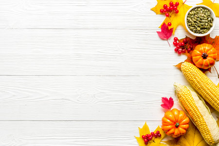 Yellow and orange pumpkinscorn, cones and autumn leaves on white wooden background for harvest fall and thanksgiving theme. cornucopias