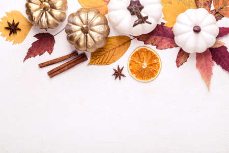 Multicolored leaves pumpkins and spices. Creative autumn layout.