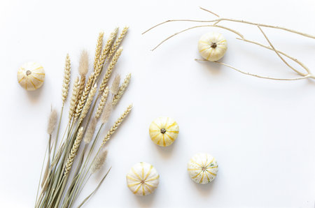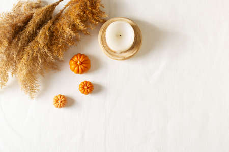 Autumn fla lay with dried pampas grass and pumpkins candle on white textile background, top view, copy space