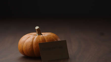 Small orange pumpkin on black walnut table with black wall background and thanksgiving card