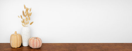 Autumn home decor on a wood shelf against a white wall background. Banner with copy space. Pumpkins and vase with grasses.