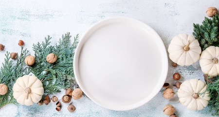 Holiday table decoration with white decorative pumpkins, thuja branches, walnuts, acorns and empty dinner plate over white wooden background. Top view with space for text