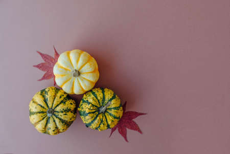 Banner with group of decorative pumpkins top view on pink background. Autumn flat lay.