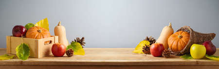 Harvest or Thanksgiving background with autumn fruits and gourds on rustic wooden table