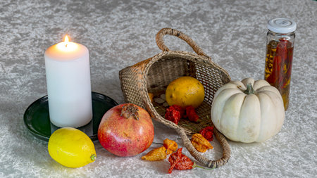 still life on a white tablecloth, fruit in a wicker basket and other objects, black background