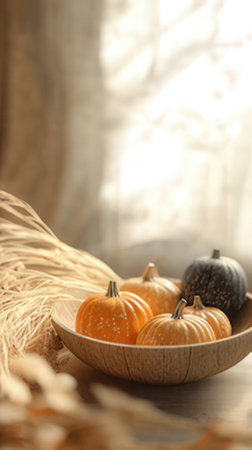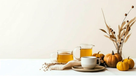 A cozy autumn scene featuring tea, pumpkins, and dried flowers. Perfect for fall vibes.