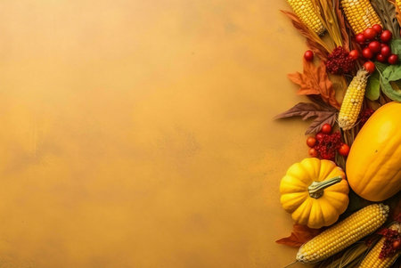 Golden autumn harvest scene with pumpkins, corn, and berries. Perfect for Thanksgiving or fall decorations.