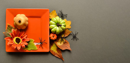 An orange square plate with a sunflower and pumpkin on a gray background with pumpkins, leaves, and spiders. Autumn composition.