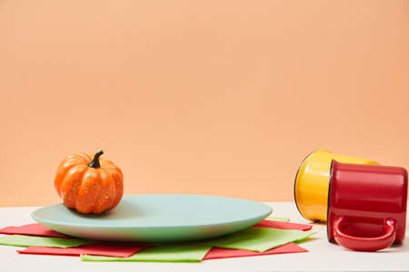 Thanksgiving day. Autumn harvest festival. Party decoration. Plate with orange pumpkin. Copy space on peach backdrop.