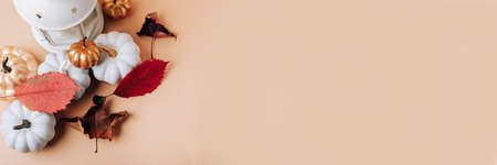 Panoramic decorative Autumn border from natural decor - white pumpkins, beige acorns, dry Fall leaves and pine cones. Flat lay, top view on off white cotton textile.