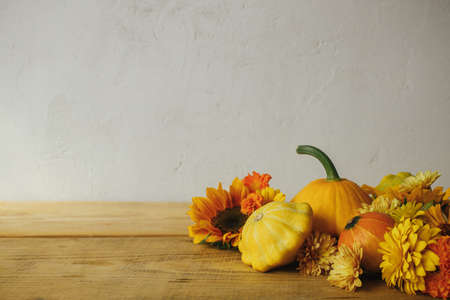 Atmospheric autumn still life. Colorful autumn flowers, pumpkins, pattypan squashes on wooden table against rustic background. Seasons greeting card, space for text. Happy Thanksgiving!