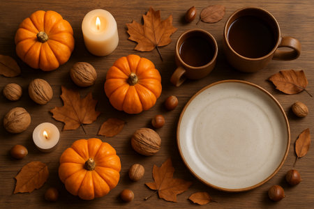 Thanksgiving autumn table setting with pumpkins, candles, nuts, and leaves on wooden background. concept of fall decor, seasonal celebration, cozy atmosphere.