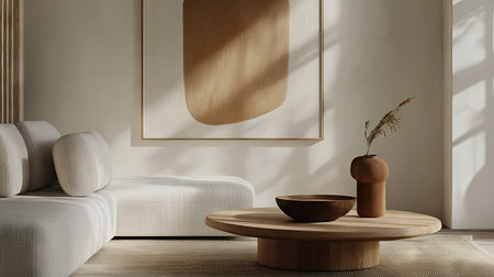 Close-up of minimalist decor elements in a living room, including a low coffee table, simple artwork, and subtle color accents