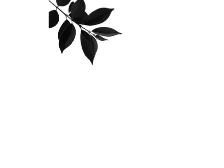A minimalist black and white image featuring a single leaf silhouette against a plain background.