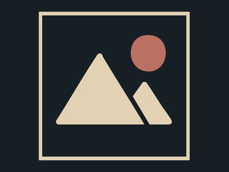 Flat minimal landscape icon with mountains and sun in square frame isolated on dark background. Concept of gallery picture, image placeholder, symbol, simple graphic design element.
