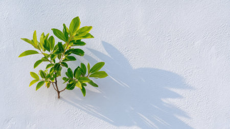 A vibrant green branch with leaves contrasts beautifully against a textured white wall, creating striking shadows. This image captures the essence of simplicity in nature.