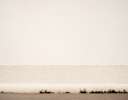 A vibrant tree with lush green leaves grows beside a smooth white wall and a gray concrete foundation creating a tranquil modern atmosphere. The setting captures simplicity and nature.