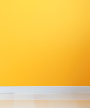 Bright yellow painted wall with white baseboard. Minimalistic textured background, copy space