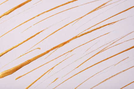 Thin golden lines and splashes drawn on white background. Abstract art backdrop with yellow brush decorative stroke. Acrylic painting with graphic stripe.