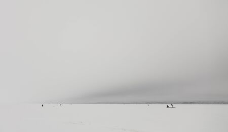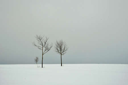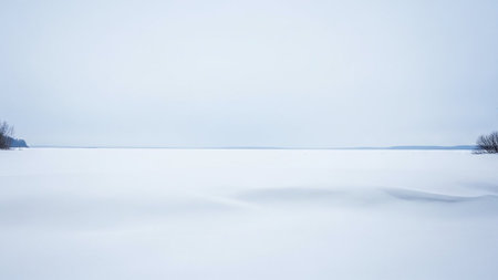 Horizon showing vast white snow covered field under a pale overcast sky with minimalist horizon and bare trees. resolution