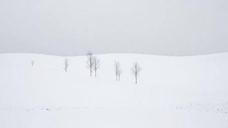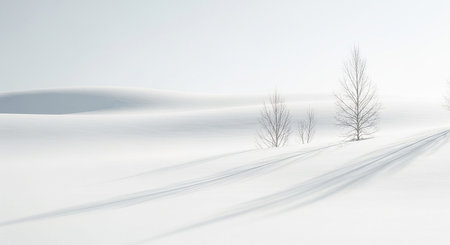 A serene, minimalist winter landscape gently rolling white snow-covered hills and a few delicate bare trees casting long, soft shadows.