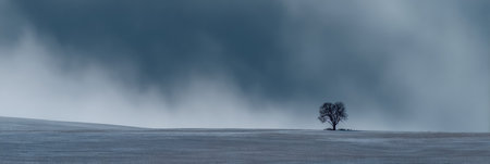 Lone lonely tree in winter snow solitude, minimalist. Generative AI image weber.