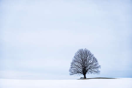 Alone Tree with Snow in winter season at Biei Patchwork Road landmark and popular for attractions in Hokkaido, Japan. Travel and Vacation concept