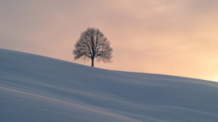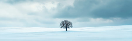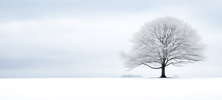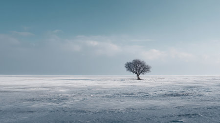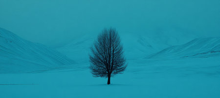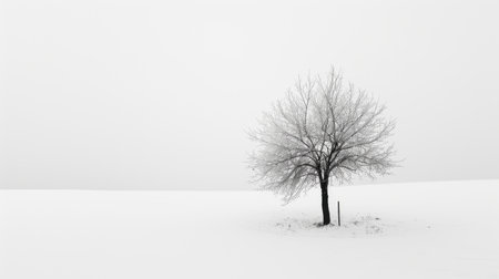 A striking lone tree stands amidst a snow-covered landscape, creating a serene and peaceful winter scene. The empty space enhances its majestic beauty.