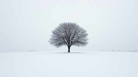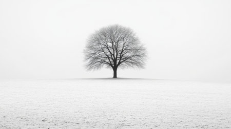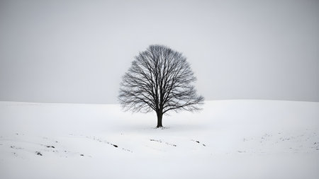 A minimalist photography showcasing a lone bare tree standing in a vast snow covered landscape creating a tranquil and serene atmosphere