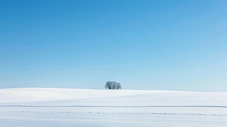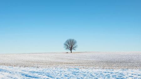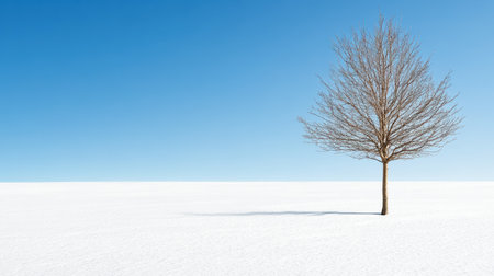 Tranquil snowy field under a clear blue sky, featuring a single bare tree in a minimalist winter scene