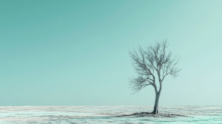 A solitary tree stands elegantly in an expansive aqua landscape, reflecting tranquility and isolation. This serene image captures the beauty of minimalism in nature.