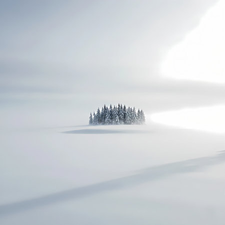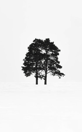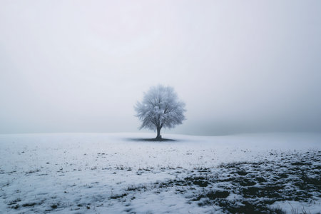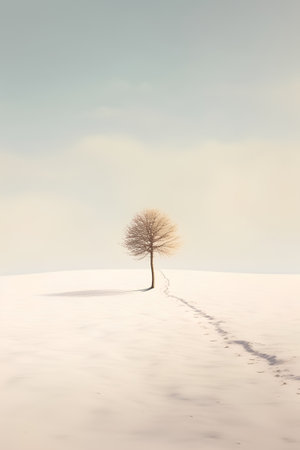 Minimalist winter landscape featuring a solitary pine tree in a snow covered field, creating a serene and tranquil atmosphere
