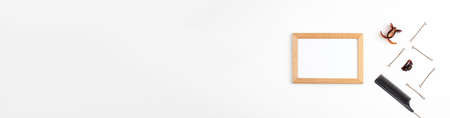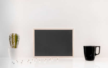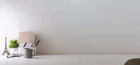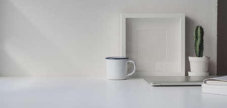 Minimal workplace with empty picture frame, book, coffee cup and pencil holder on white table. Copy space for your text.