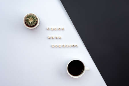 Simple workplace with notebook, coffee cup and succulent plant on white table. Flat lay.